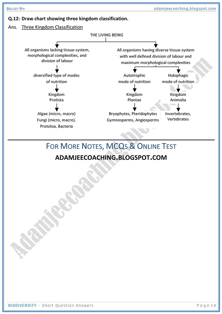 Biology 9th class notes, Short Question Answers from Chapter : 3 'Biodiversity' (Science Group / Sindh Board, ix class ninth)